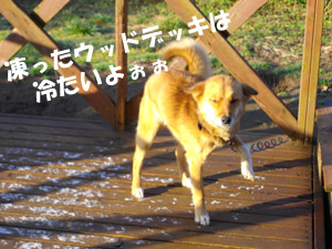 凍った板状態のウッドデッキにお約束のようなリアクション・・・